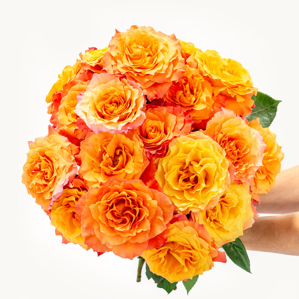 Unfurling magenta-tipped petals with an orange center reveal a stunning tone of sunset colors. Versatile and captivating, these bicolor roses offer endless arrangement possibilities. Delight in their beauty as they bloom 2-3 days after delivery. Choose from our hand-tied bouquets, available in an 18-stem size, accompanied by a flower food sachet.